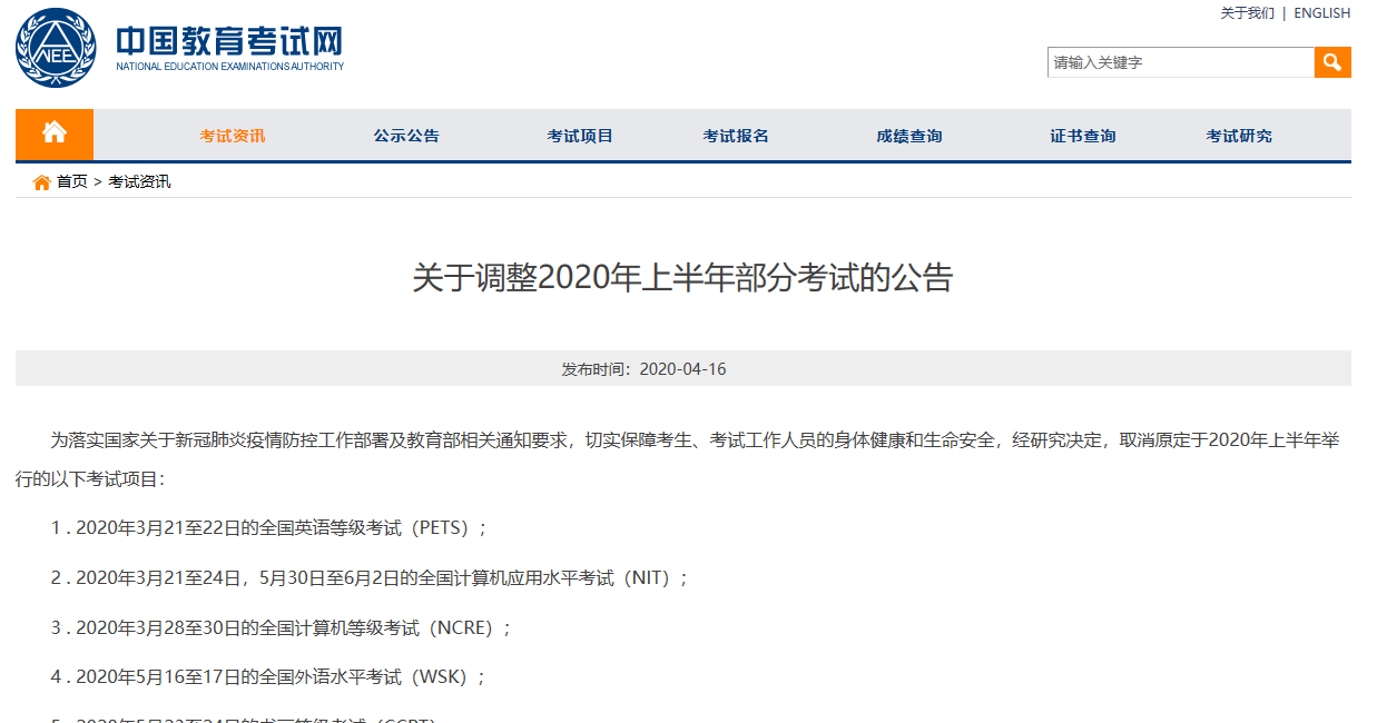 為落實國家關于新冠肺炎疫情防控工作部署及教育部相關通知要求,切實保障考生、考試工作人員的身體健康和生命安全,經研究決定,取消原定于2020年上半年舉行的以下考試項目: